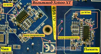 Перейдём к делу. За напряжение на чип и память отвечают микросхемы RT3292A, находящиеся на обратной стороне платы. Для увеличения напряжения необходимо и достаточно впаять переменный резистор к 5 и 7 ноге микросхемы. Отсчёт производится против часовой стрелки, начиная с ноги, отмеченной впадиной. Номинал резистора для чипа - 10 кОм, для памяти - 50 кОм.