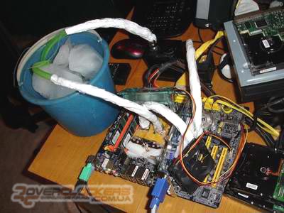 Естественно, была снова сделана пайка для вольтмода. После запуска системы на самой, что ни на есть, "ледяной воде" получил 8°C на видеочипе без нагрузки.