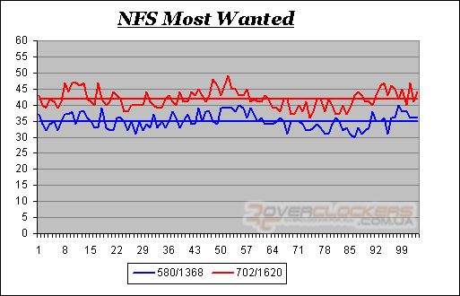 Так были установлены мировые достижения в 3DMark03, 3DMark05 и 3DMark06 на данной видеокарте. Через пару дней я всё же снял это великолепие поролона, и собрал системник. Но в отличие от весеннего вольтмода, моя видеокарта сейчас прекрасно функционирует на 702/1620 МГц при напряжении 1,47 В на чипе. И я бы не назвал этот разгон "маникюрным". Разница между минимальным и максимальным FPS очевидна, особенно если взглянуть на этот временной график игры NFS: Most Wanted.