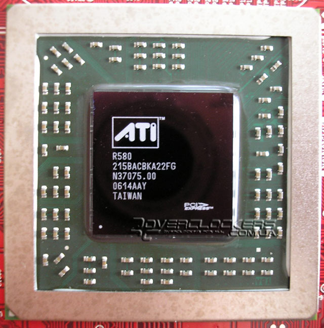 Чип просто огромный, если сравнить его визуально с теми же RV530, которые ставят на карты серии X1600. С другой стороны имеем большую площадь контакта и, соответственно, хорошую теплопередачу.