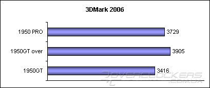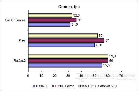В синтетическом тесте младшая модель отстает от старшей всего на 9,5%. А при разгоне производительность в 3DMark увеличивается почти на 13%, и GT версия обгоняет 1950 PRO почти на 5%