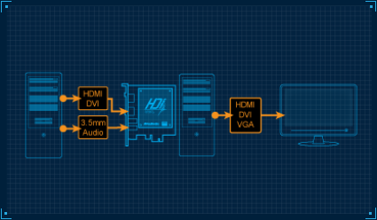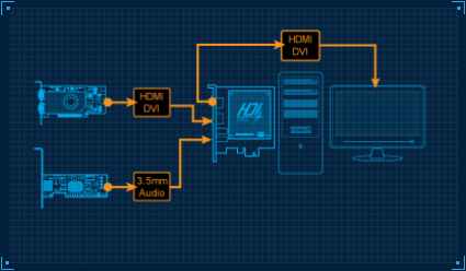 Если планируется производить запись с того же ПК, куда и установлена карта захвата, необходимо выход видеокарты (HDMI или DVI плюс имеющийся переходник) подключить ко входу Live Gamer HD, а HDMI-Out на ней соединить с монитором. Причем, если монитор имеет лишь вход DVI — нет проблем, используем еще один комплектный переходник. Грубо говоря, карта подключается «в разрыв» между видеокартой и монитором. Схема подключения звуковой карты аналогична — с помощью имеющегося кабеля со штекерами 3,5 мм, соединяем выход звуковой карты со сходом карты захвата, а к выходу последней подключаем акустическую систему или, например, наушники.