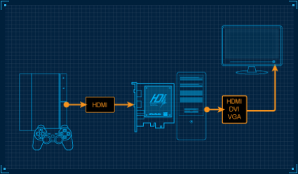 При необходимости захвата видео с отдельного устройства, например игровой приставки, ноутбука или просто еще одного компьютера, порядок действий еще проще: HDMI-выход подключаем ко входу карты захвата, и при необходимости соединяем аналоговый аудиовыход внешнего устройства с аудиовходом Live Gamer HD. Далее все то же самое, выходы HDMI и аналогового аудио подключаются к монитору или телевизору и при необходимости к акустической системе.