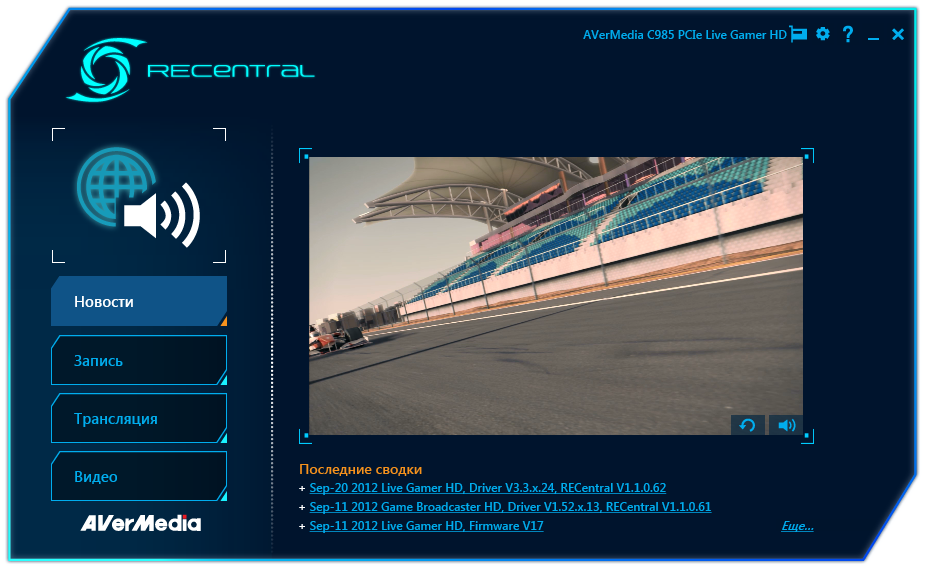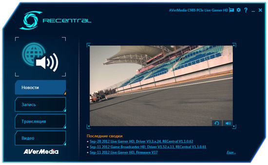 Слева имеются четыре основных пункта меню. Раздел «Новости» представляет не много интереса и содержит сводку новостей AVerMedia.