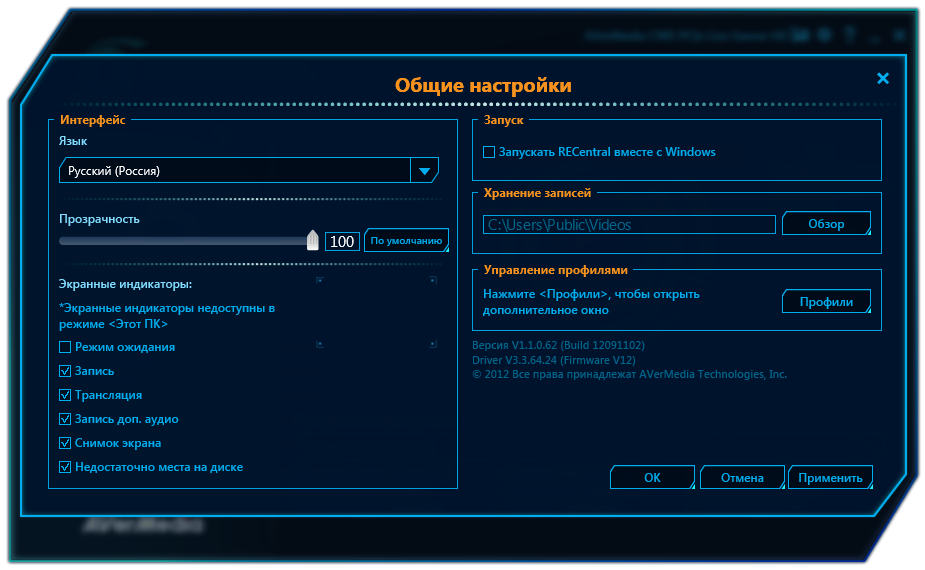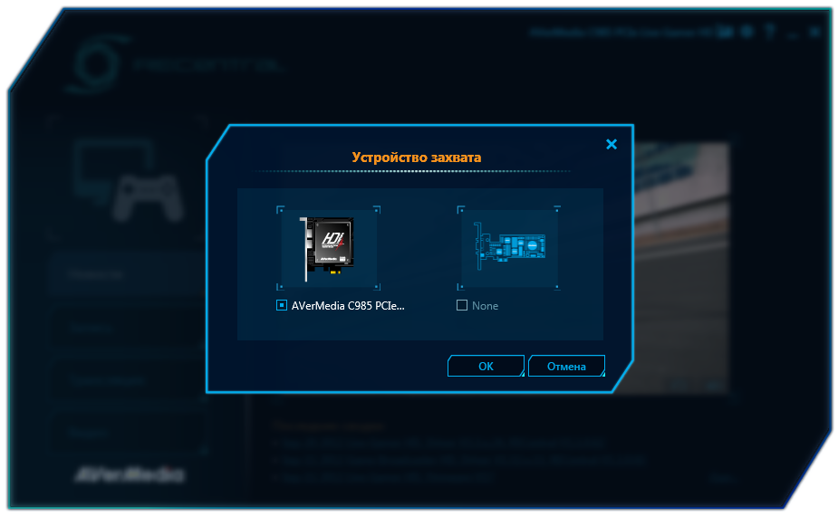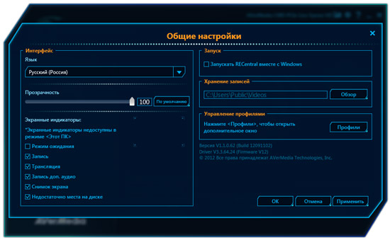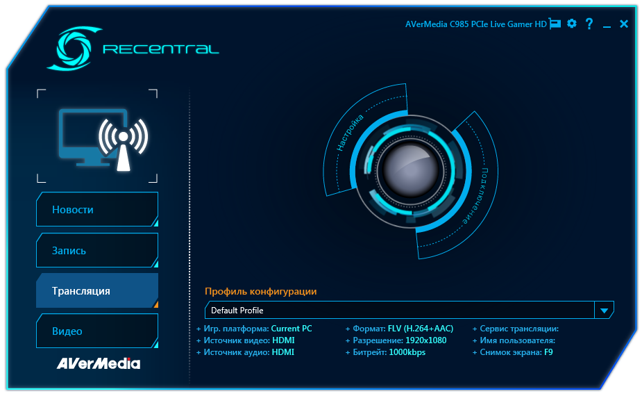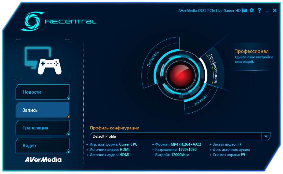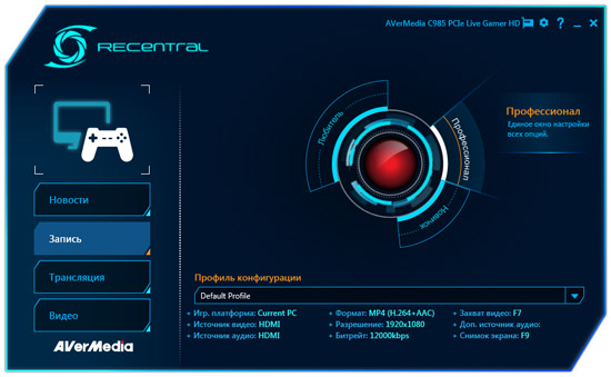 Поставляемое с устройством программное обеспечение носит название RECentral и служит для полного управления и контроля за записью. Установка программного обеспечения и драйверов не несет чего-то необычного, все обыденно. После установки в «Диспетчере устройств» мы обнаружим новое устройство — AVerMedia C985 PCIe Live Gamer HD. При запуске RECentral на экране появляется анимированный логотип, а светодиоды горячей кнопки попеременно загораются. Нажатием этой кнопки, кстати, также инициализируется запуск программы, если до этого момента она не была запущена.