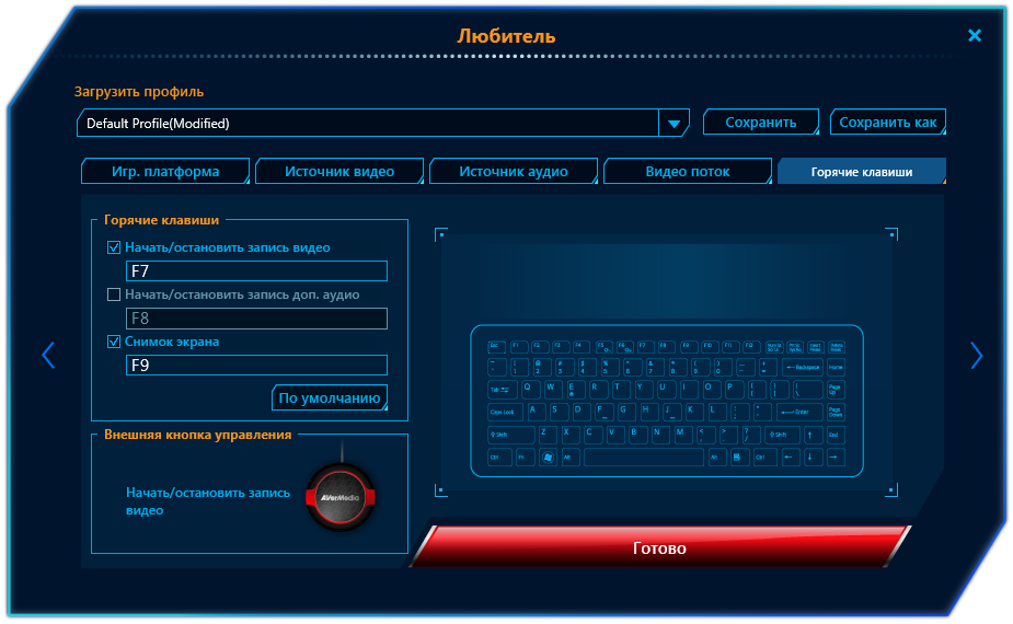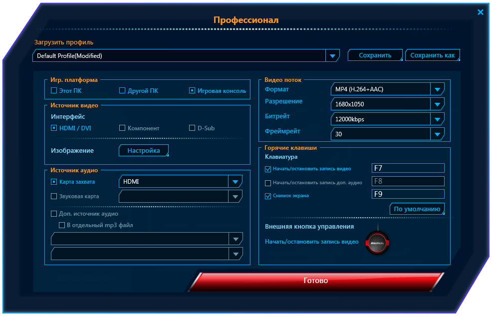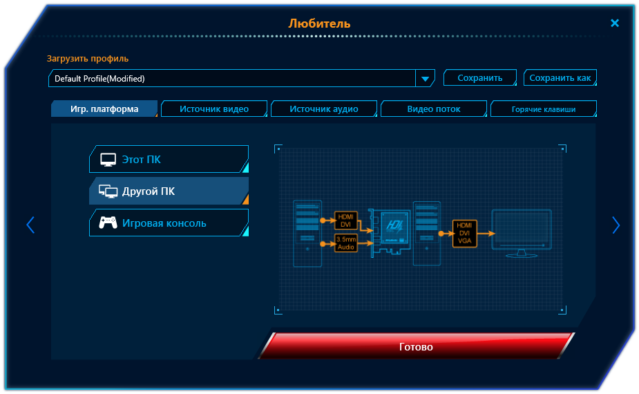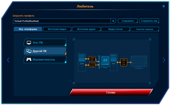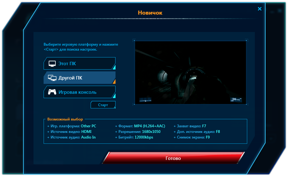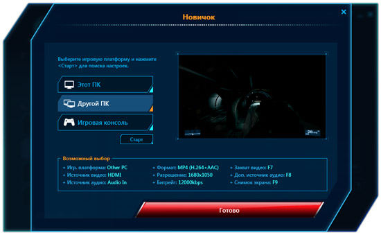 После нажатия кнопки «Готово», приложение сворачивается в область уведомления на панели задач и ждет команды начала записи по нажатию аппаратной кнопки или программных горячих клавиш. Причем, если в качестве источника выбраны «Другой ПК» или «Консоль», то на экране появится еще и окно, отображающее изображение из этого внешнего источника. В нем же присутствуют отдельные кнопки для запуска/остановки записи, снятия скриншотов и включения/выключения звука.