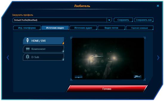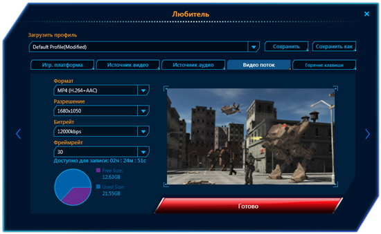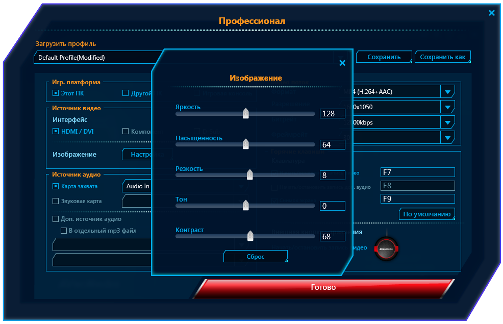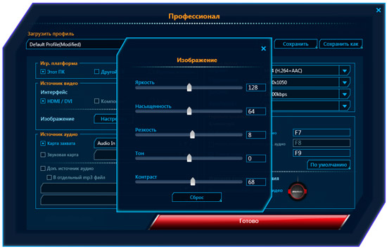 С выбором источника видео все понятно, более интересная настройка — качество видеопотока. Здесь предлагается выбрать разрешение записываемого ролика, его битрейт и количество кадров в секунду. Напомним, что максимально доступным режимом является разрешение 1920x1080 точек при частоте кадров равной 30. Нужно обратить внимание на то, что эта настройка никак не отразится на изображении на мониторе, она устанавливает только параметры для записи изображения. Поэтому, если вы хотите играть с разрешением Full HD, но запись производить в меньшем разрешении — пожалуйста. Максимально доступный битрейт — ни много ни мало — 20000 Кбит/сек. Очень неплохо! Установить переменный битрейт возможности нет. Также имеются основные регулировки изображения — яркость, контрастность, насыщенность, тон и контраст.