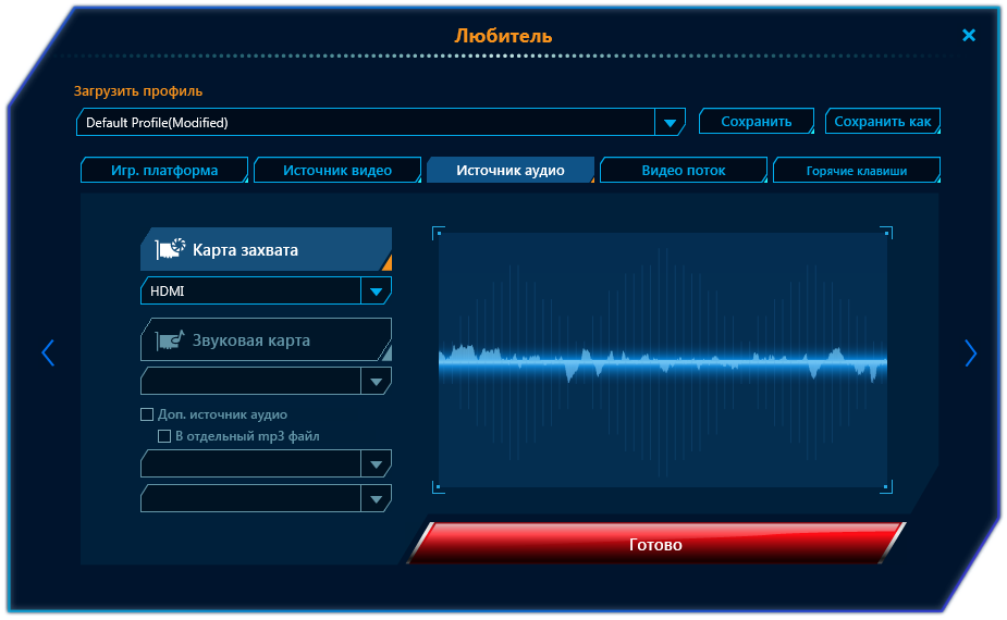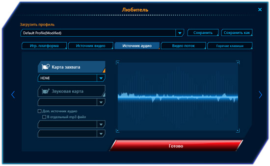 Здесь же можно выбрать и источник звука — либо будет использоваться сигнал, передаваемый по HDMI, либо можно для этой цели использовать аналоговые аудиовыходы звуковой карты. При желании также можно записывать и звук от дополнительного источника, например, микрофона, подключенного к соответствующему входу звуковой карты. При этом есть варианты либо микшировать звук этого источника с основным, либо писать его в отдельный файл.