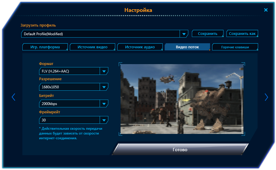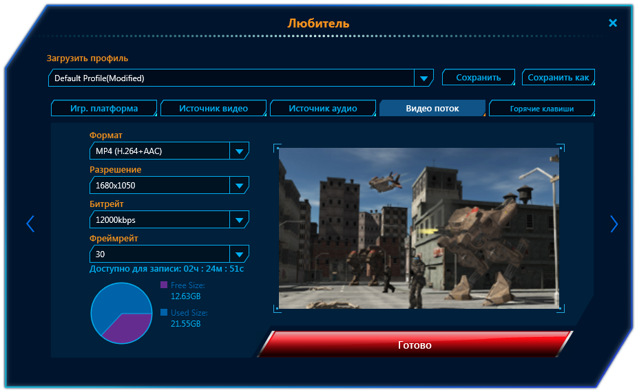 Настройка действительна проста. Прежде всего, необходимо выбрать параметры видеопотока. Делается это на нескольких вкладках, по принципу режима «Любитель», о котором мы говорили ранее.