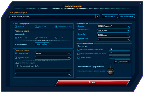 «Профессионал» — наиболее привычный для продвинутых пользователей режим, где все настройки собраны в одном окне. На его примере мы и будем дальше рассматривать возможности настроек записи.