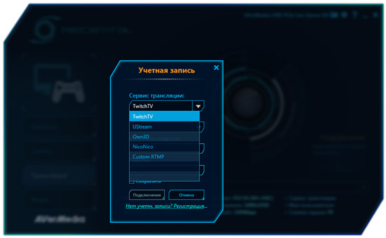 Следующий пункт, «Трансляция», однозначно понравится стримерам. С его помощью буквально в несколько кликов можно организовать прямую онлайн-трансляцию, скажем, игрового процесса, используя для этого один из популярных онлайн-сервисов. На момент подготовки обзоров мы использовали ПО версии 1.1.0.62, в котором из предложенных имелись Ustream, Own3D, TwitchTV и некий NicoNico. Кроме того, вы можете организовать трансляцию с помощью собственного сервера RTMP.