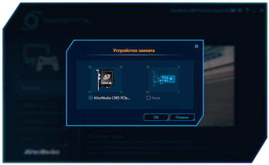 Часть настроек находится вне рассмотренных пунктов, они вызываются нажатием одной из пиктограмм в верхнем правом углу окна. Кнопка с пиктограммой в виде платы расширения открывает окно, позволяющее выбрать используемую карту, если установленных устройств несколько. Кстати, было бы очень интересной возможностью одновременно использовать несколько карт захвата. Но на данном этапе запустить одновременно больше одной копии RECentral невозможно.