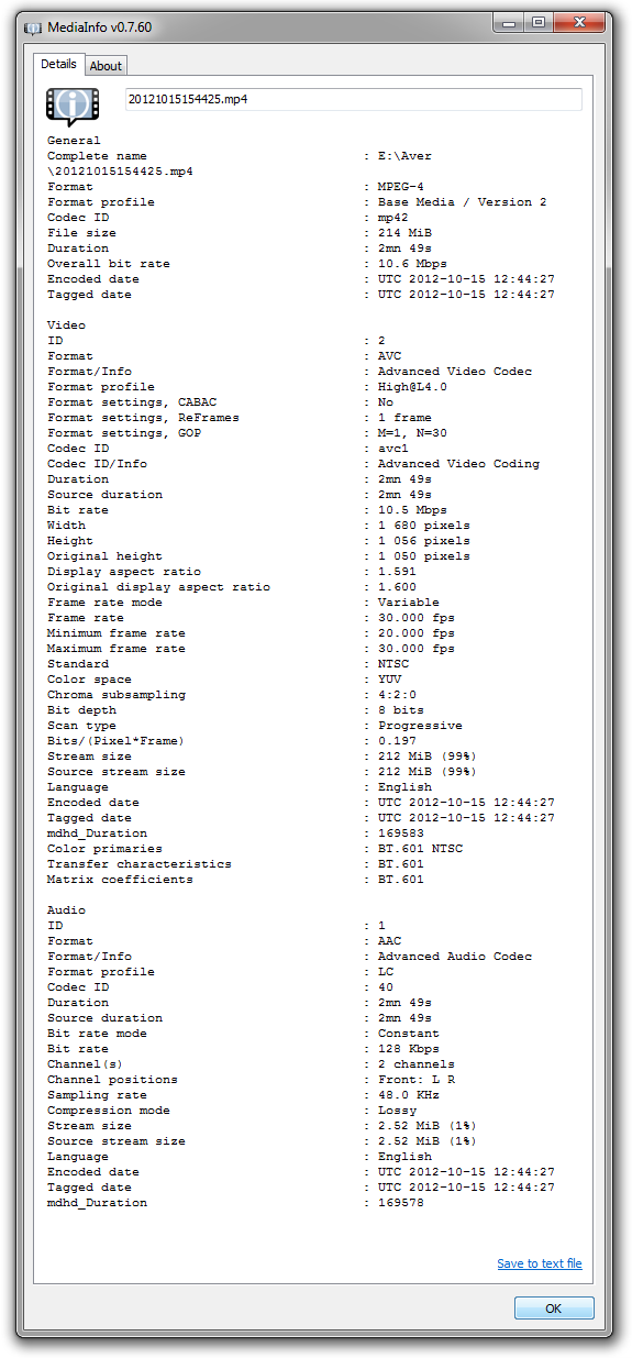 Ниже представлены подробные характеристики видео, полученные с помощью утилиты Mediainfo. Какие-либо претензии к захвату видео и в максимальном режиме 1920x1080@30p также отсутствуют.