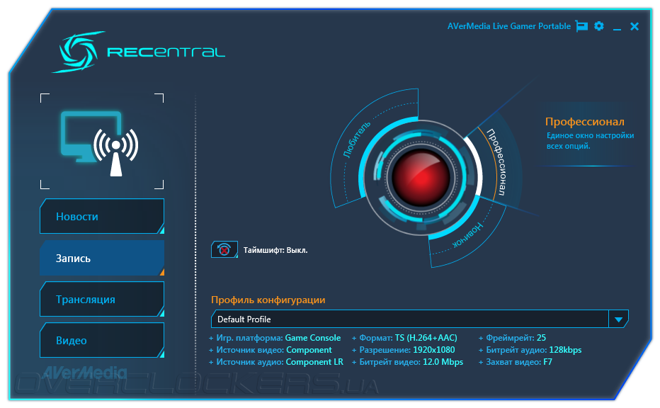 Основная работа будет происходить в разделе «Запись». Как и ранее, для различных групп пользователей созданы несколько режимов, позволяющих в зависимости от их познаний настраивать те или иные параметры.