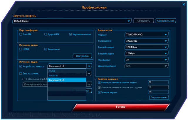 Самое интересное нас ждет в разделе настройки видеопотока. Само собой, Live Gamer Pоrtable имеет аппаратный кодер H.264, который полностью избавляет центральный процессор компьютера от этой задачи. Как уже было сказано выше, максимальным режимом записи является 1920x1080@30p, а максимально доступный битрейт равен 60 Мбит/с. В качестве формата файла можно выбрать .mp4 или .ts
