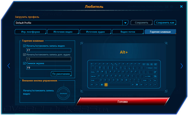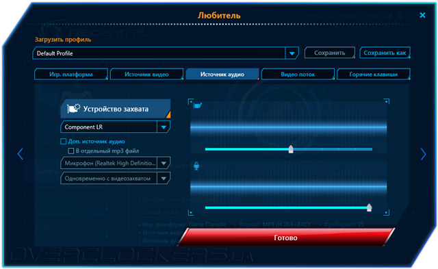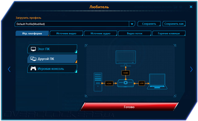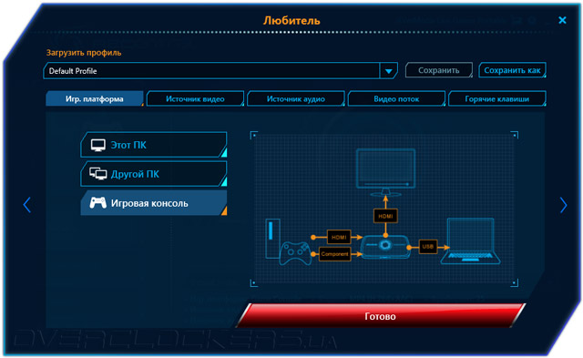 Ну и последний режим — «Любитель» — также позволяет установить все основные параметры захвата, но настройки сгруппированы на нескольких независимых вкладках, а разделы с выбором источника сигнала имеют еще и иллюстрации, демонстрирующие схему подключения устройства записи.