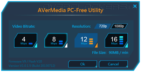 Для использования устройства в таком независимом режиме, необходимо произвести предварительную настройку. Для чего требуется запустить приложение AVerMedia PC-Free Utility, которое позволит установить основные параметры записи — выбрать необходимый размер и битрейт получаемого видео.