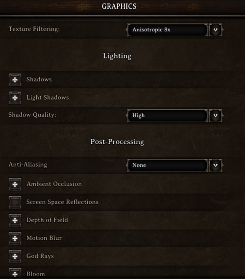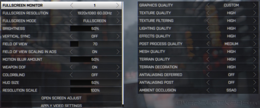 Все основные параметры графики на High. Отключено сглаживанием постобработки (Antialiasing Post) и мультисэмплинг. Качество постобработки среднее. Для более точной иллюстрации параметров приведем соответствующий скриншот.