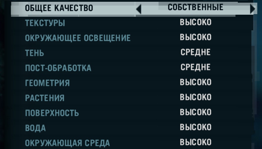 Почти все параметры графики на максимуме, включая Ultra-текстуры. Только «тени» и «рельефность» понижены до высокого уровня. Сглаживание отключено.