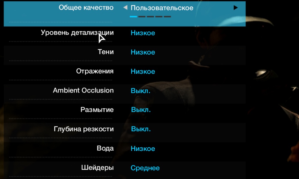 Все параметры графики понижены до минимального уровня. В случае текстур это предусматривает вариант «среднее качество». Глобальное освещение полностью отключено. Вручную повышен параметр качества шейдеров до среднего уровня.