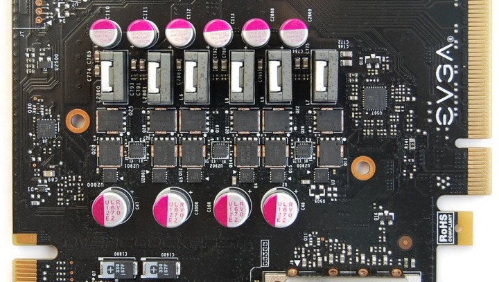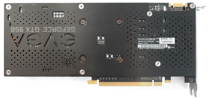 Обратная сторона закрыта перфорированной металлической пластиной. Необычный атрибут для представителя такого уровня. Благодаря нему EVGA GTX 950 FTW ACX 2.0 выглядит очень солидно.