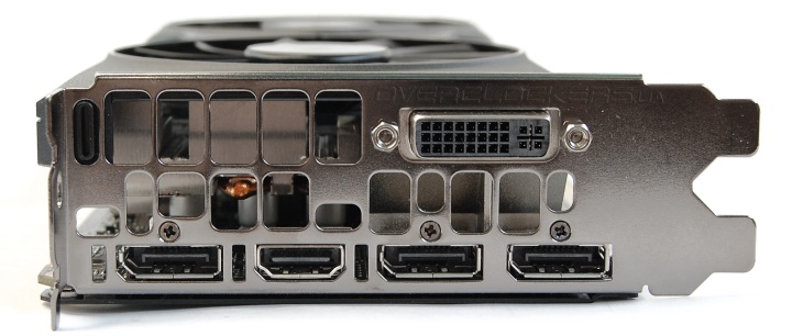 Набор интерфейсных разъемов таков: три DisplayPort, один HDMI и один DVI. Свободное место на задней панели испещрено крупными вентиляционными отверстиями.