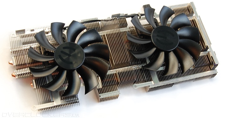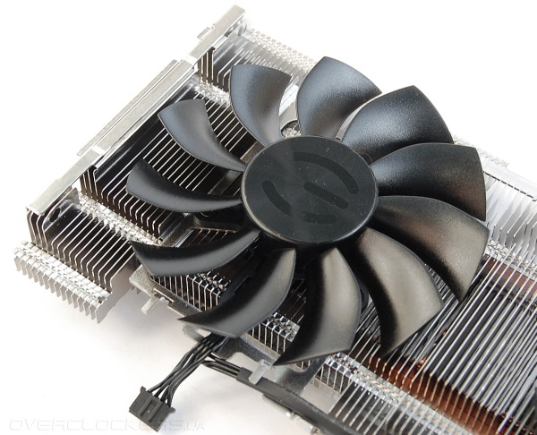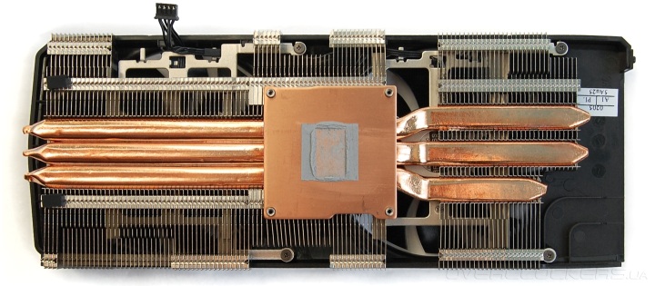 Конструкция системы охлаждения знакома по EVGA GTX 960 SSC. Двухсекционный радиатор с тремя медными тепловыми трубками диаметром 8 мм. Контакт с графическим процессором осуществляется через медное основание.