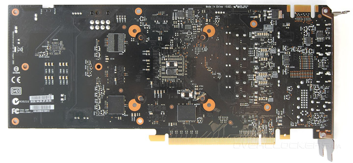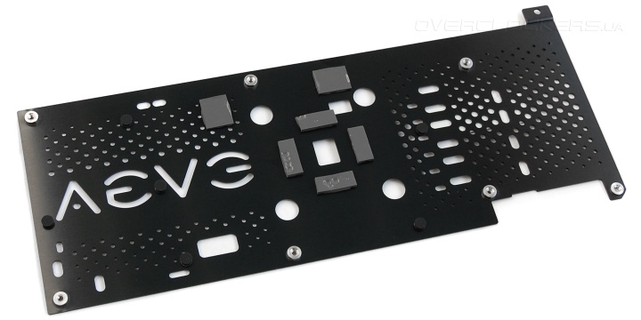 Задняя пластина имеет подушечки в зоне контакта с микросхемами памяти и вокруг монтажной зоны GPU. Таким образом, этот элемент участвует в охлаждении чипов GDDR5 и снимает часть тепловой нагрузки с самой горячей части текстолита.