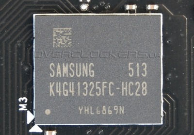 Два гигабайта памяти набраны микросхемами Samsung K4G41325FC-HC28 в количестве четырех штук, которые распаяны с двух сторон платы.