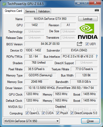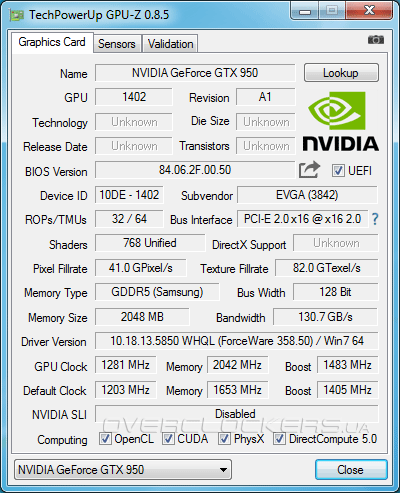 По разгону данная модель показала максимально близкие результаты с GeForce GTX 960 на аналогичной PCB, но немного ниже по частоте ядра в сравнении с ранее протестированными GeForce GTX 950. По базовой частоте мы достигли 1281 МГц при максимальном значении Boost в 1520 МГц. По памяти EVGA рекордсмен — стабильные 8162 МГц, что является лучшим результатом в своей серии.