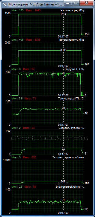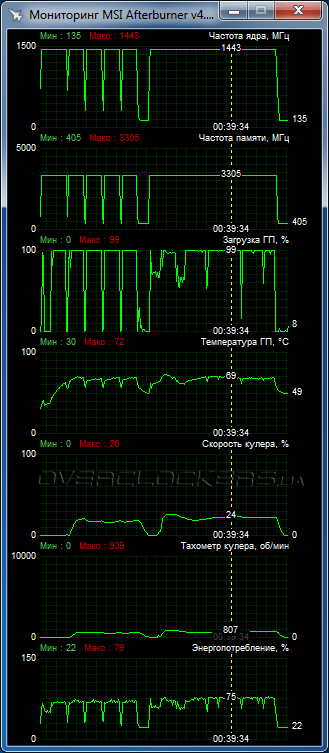 Частота Boost стабильно держалась на уровне 1443 МГц. Отметим, что недавно рассматривавшийся видеоадаптер ASUS STRIX-GTX950-DC2OC-2GD5-GAMING при таком же пиковом Boost работал с небольшими просадками.