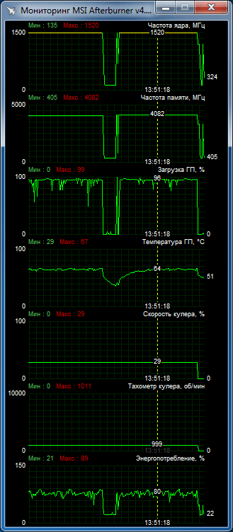 Нагрев ядра при игровой нагрузке составили 70–72 °C при 25 °C в помещении. Эти показатели на уровне EVGA GeForce GTX 960. Но скорость вращения вентиляторов ниже — в среднем около 800 об/мин с небольшими отклонениями в большую сторону. При столь низких оборотах о шуме можно забыть. Это проиллюстрировано ниже скриншотами мониторинга в Far Cry 4 и Metro: Last Light.