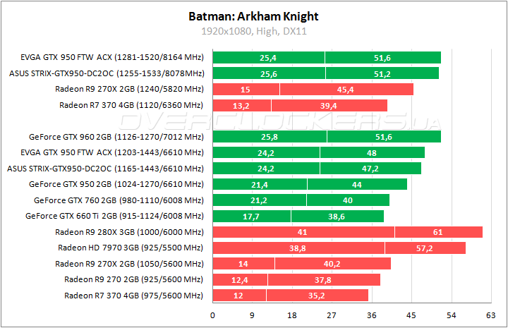 В Batman: Arkham Knight простая версия GeForce GTX 950 производительнее GeForce GTX 760 и Radeon R9 270X. ASUS и EVGA быстрее еще на 8–13%. Разгон позволяет сравняться с GeForce GTX 960. Radeon HD 7970 и Radeon R9 280X впереди благодаря большому объему видеопамяти, что для игры весьма критично.
