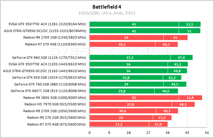 Не более 7% разница между EVGA и референсным GeForce GTX 950 в Battlefield 4. Отставание от Radeon HD 7970 на уровне 5–7%, разница с GeForce GTX 960 еще меньше. Прирост ускоряет EVGA FTW на 13–14%, что позволяет обогнать указанные карты и сравняться с Radeon R9 280X.