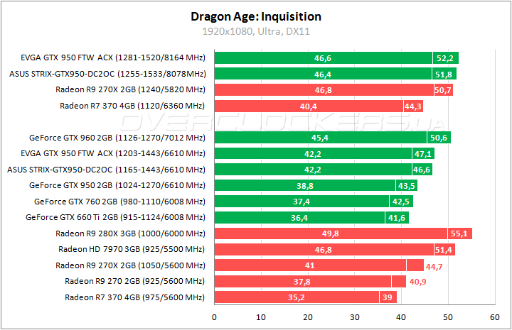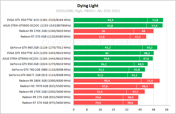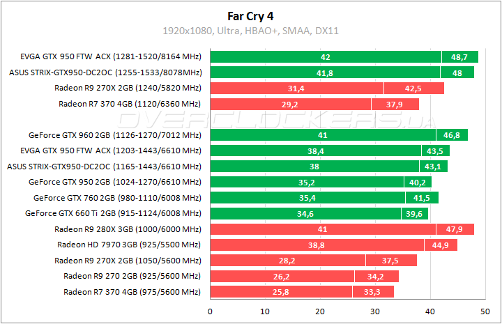 Минимальное отставание EVGA от Radeon HD 7970 в Far Cry 4 при внушительном отрыве от младших Radeon. Преимущество над референсным GeForce GTX 950 до 9%. Разгон придает ускорение в 9–12%, что позволяет добиться небольшого перевеса над GeForce GTX 960 и Radeon R9 280X с рекомендованными частотами.
