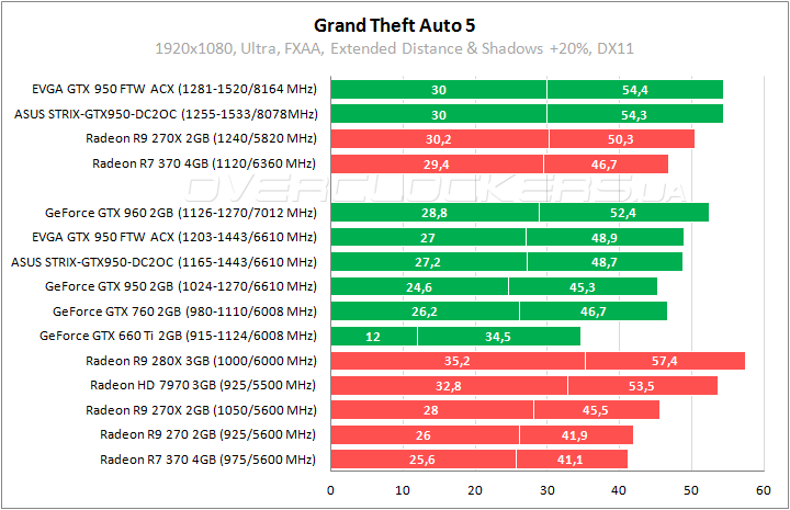 Герой обзора в Grand Theft Auto лучше Radeon R9 270X по средней частоте кадров, но немного слабее по минимальному fps. Отставание от GeForce GTX 960 на уровне 7%, что перекрывается разгоном EVGA. Разница с ASUS стремится к нулю.