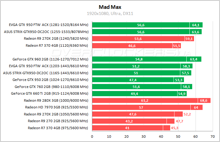 В Mad Max видеоадаптер EVGA лучше референса на 8–9% и примерно такое же отставание от GeForce GTX 960. В сравнении с конкурентами от AMD у героя обзора средняя позиция между Radeon R9 270X и Radeon HD 7970. Разгон ускоряет на 10–11%, позволяя чуть обогнать старшего товарища от NVIDIA.
