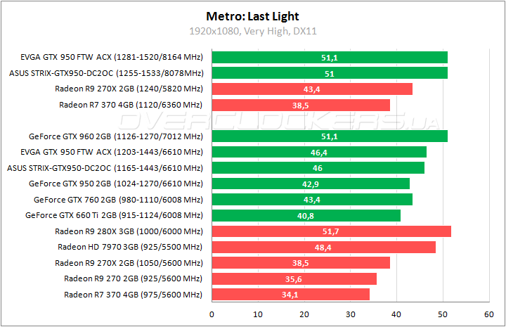 В Metro герой обзора на 8% быстрее обычной версии GeForce GTX 950 при отставании около 10% относительно GeForce GTX 960. Разгон как раз позволяет выйти на уровень старшего брата и минимизировать отставание от Radeon R9 280X. Отрыв от младших представителей AMD огромный.