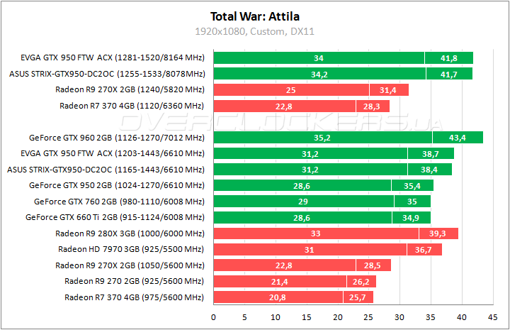 В Total War наблюдается небольшое преимущество EVGA FTW над Radeon HD 7970, а разгон позволяет легко обогнать Radeon R9 280X. Отставание от GeForce GTX 960 на уровне 12–13%, что разгоном не компенсируется в полной мере. При начальных частотах EVGA быстрее Radeon R9 270X почти на 37%.