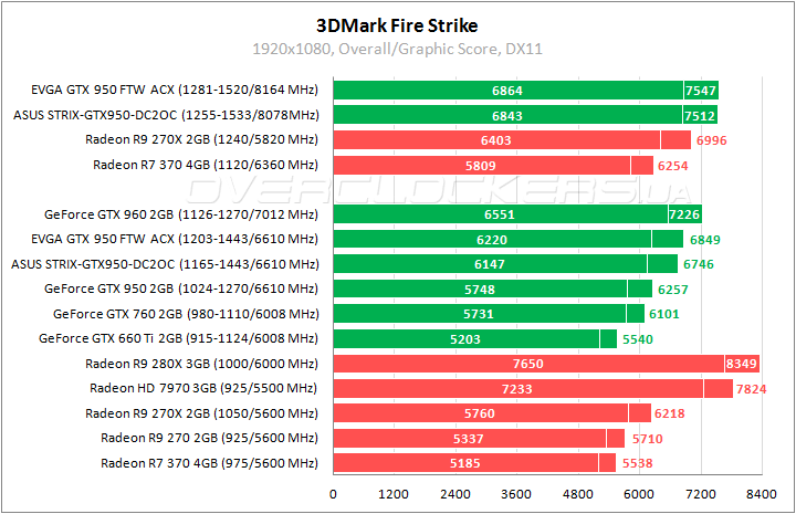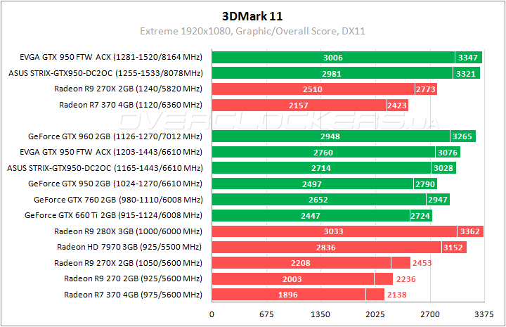 В тесте 2011 года ускоренные версии GeForce GTX 950 буквально наступают на пятки старому флагману Radeon HD 7970. А в разгоне EVGA практически сравнивается с Radeon R9 280X, который работает на рекомендованных частотах. Первоначальное отставание от старшего GeForce в 7% легко перекрывается разгоном.