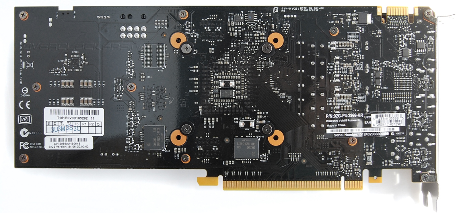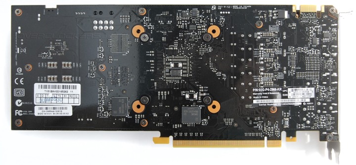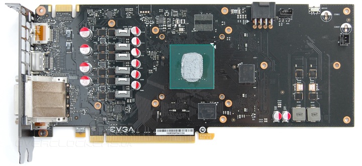 Размеры печатной платы не отличаются от общих размеров, хотя многие карты этой серии выпускаются в укороченном варианте с компактной PCB. В углу, возле разъема питания, есть небольшой вырез. Там располагается переключатель BIOS. Видеокарта может работать с двумя прошивками, что пригодиться любителям тонких экспериментов с разгоном.