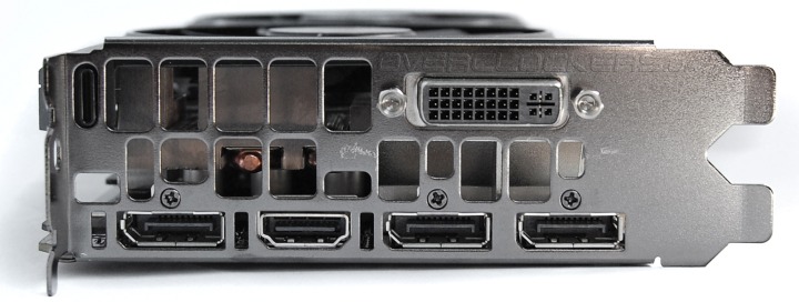 Набор интерфейсных разъемов соответствует стандартной конфигурации эталонной версии GeForce GTX 960: три DisplayPort, один HDMI и один DVI. Свободное место на задней панели испещрено вентиляционными отверстиями.