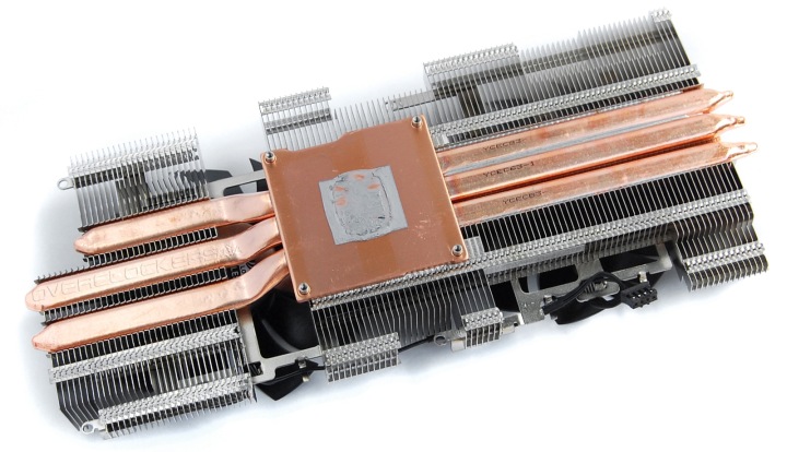 Трубки приплюснуты и тянутся вдоль плоскости платы, неся на себе массив пластин, рассеивающих тепло. Трубки напаяны на основание, две спаяны между собой в месте соприкосновения почти по всей своей длине.