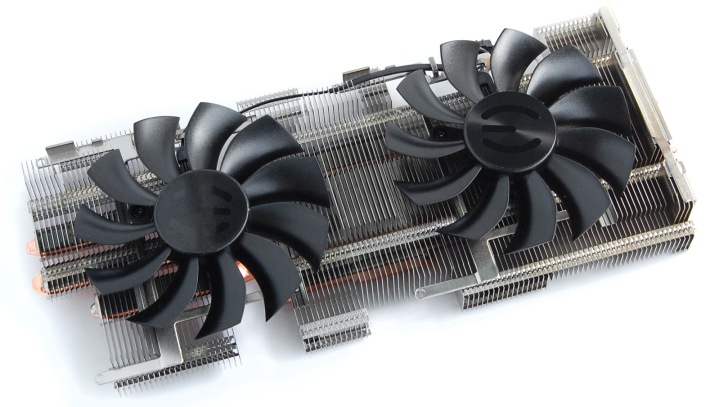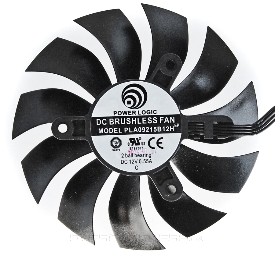 Пара вентиляторов Power Logic PLA09215B12H диаметром 92 мм обеспечивают обдув всей конструкции. Крыльчатка выделяется тем, что основной изгиб лопастей направлен в сторону противоположную их движению. Особый дизайн и конструкция вентиляторов являются следствием изысканием инженеров EVGA. По утверждению производителя это обеспечивает снижение шума.
