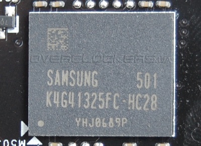 Типовые два гигабайта памяти набраны не менее типовыми микросхемами Samsung K4G41325FC-HC28 в количестве четырех штук, распаянных с обоих сторон платы.