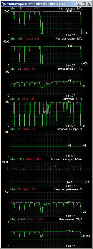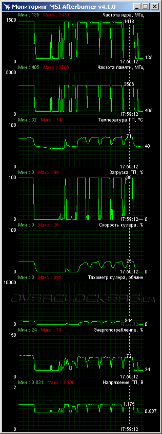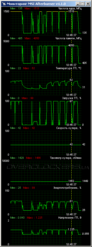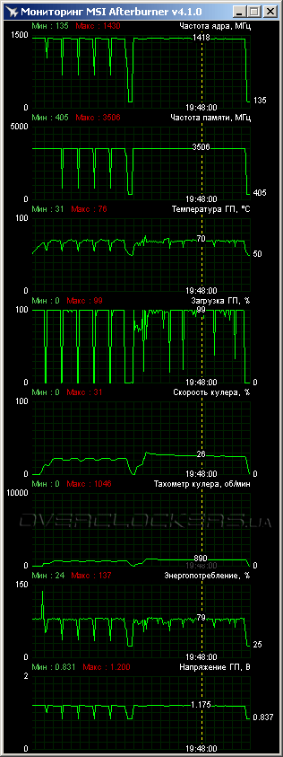 Для поддержания нормального температурного режима при разгоне обороты обдувающих вентиляторов были вручную повышены до 42% от максимума (1450–1460 об/мин). И температура даже понизилась относительно начального уровня. Так что для постоянного режима можно ограничиться меньшими значениями или простым автоматическим режимом управления вентиляторами.