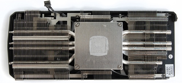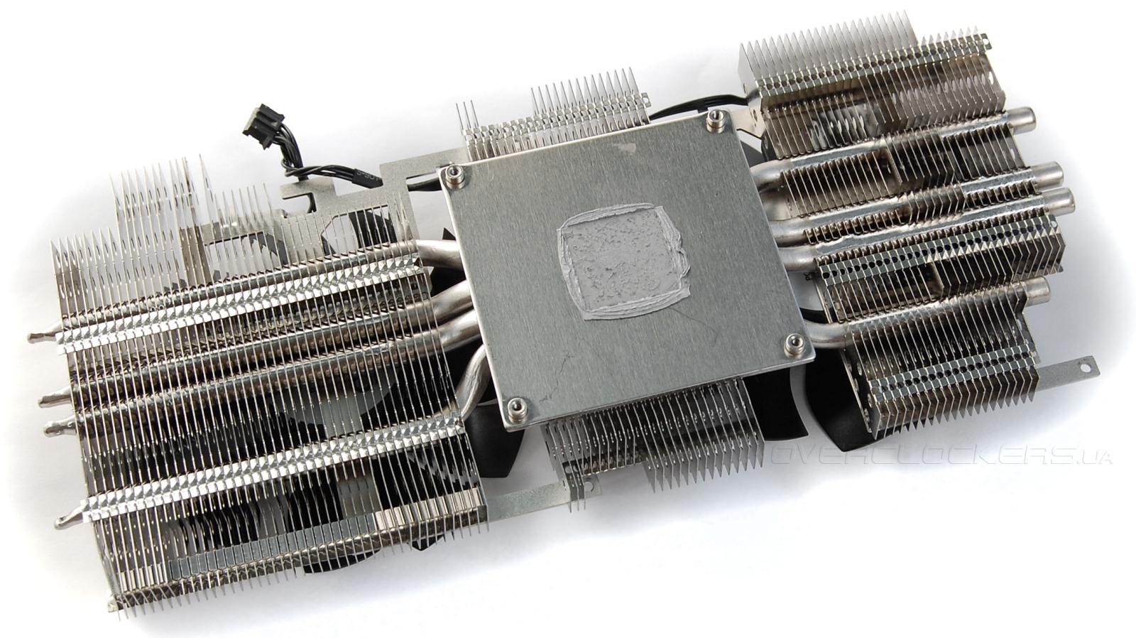 Взглянем ближе на систему охлаждения. Под кожухом скрыт серьезный радиатор с четырьмя тепловыми трубками и большим основанием.