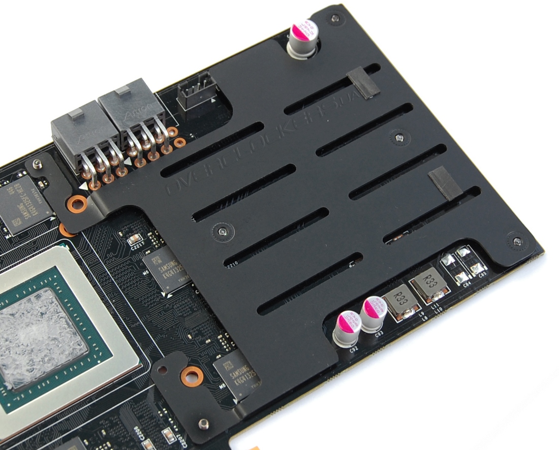 Никаких урезанных кусков текстолита, у EVGA используется большая плата. Странно лишь, что при таких размерах PCB разъемы питания находятся примерно в середине видеокарты, а не в углу. Для подключения и прокладки кабелей внутри системного блока это не лучший вариант.