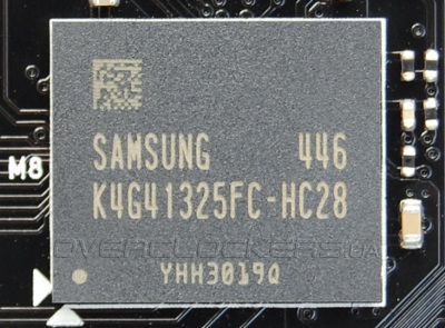 Восемь микросхем памяти Samsung K4G41325FC-HC28 распаяно с двух сторон платы.
