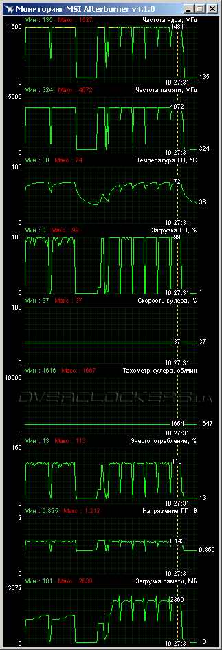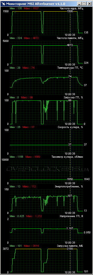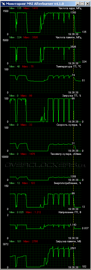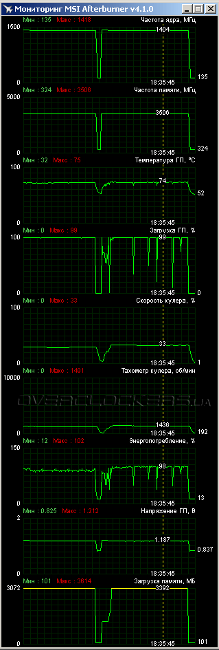 Видеокарта тестировалась в открытом корпусе при температуре внутри помещения 23 °C. В таких условиях при игровой нагрузке ядро грелось до 74–75 °C. Ранее протестированные нереференсные модели GeForce GTX 970 были холоднее на несколько градусов, но для столь мощной видеокарты это тоже отличные показатели. При этом скорость вращения вентиляторов держалась на низком уровне в 1400–1500 об/мин при минимальном шуме. Ниже отображены графики мониторинга параметров в Assassin’s Creed: Unity с Far Cry 4 (слева) и Battlefield 4 (справа).
